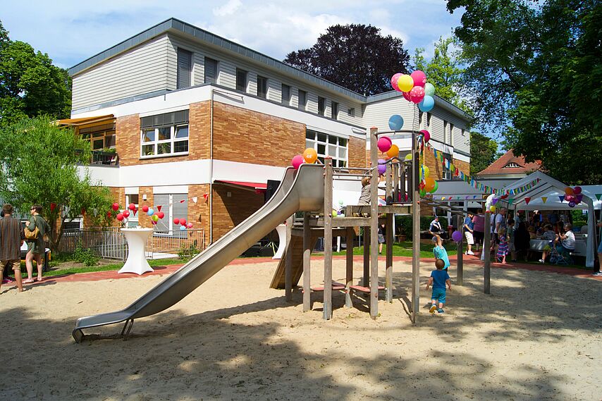 Jeder Gruppe steht ein Gruppenraum mit offener Wohnküche zur Verfügung. Ein großer Garten mit Spielgeräten eröffnet zahlreiche Möglichkeiten zur Freizeitgestaltung. Ein Fahrstuhl ermöglicht auch Rollstuhlfahrern einen geeigneten Zugang.