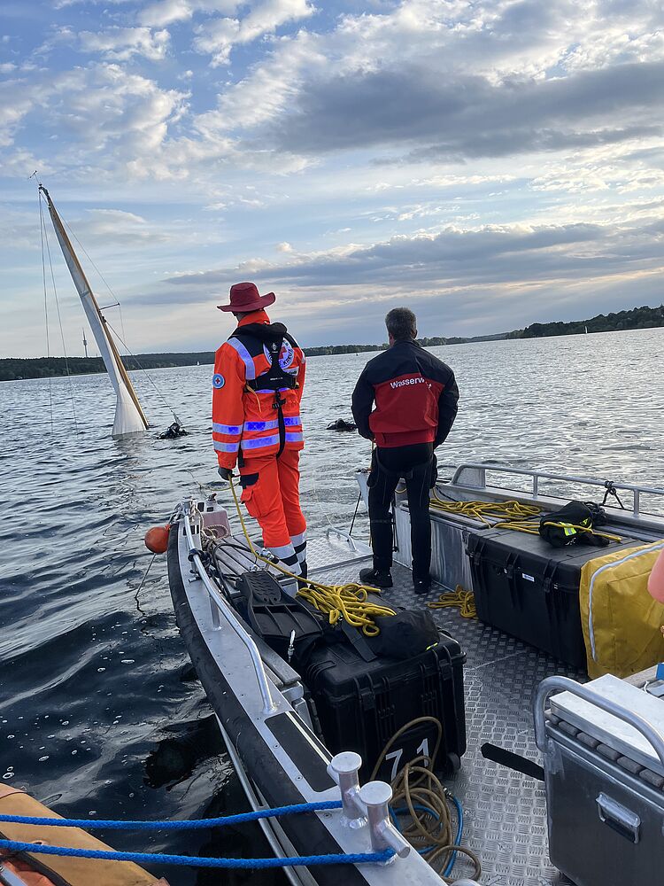 Das Suchen und Finden einer Person in einem Fluss oder See unter Wasser übernehmen unsere Taucherinnen und Taucher. An einer Leine gesichert durchkämmen sie das Suchgebiet, um eine Person im Wasser oder ein versunkenes Boot auch bei schlechter Sicht zu finden.
